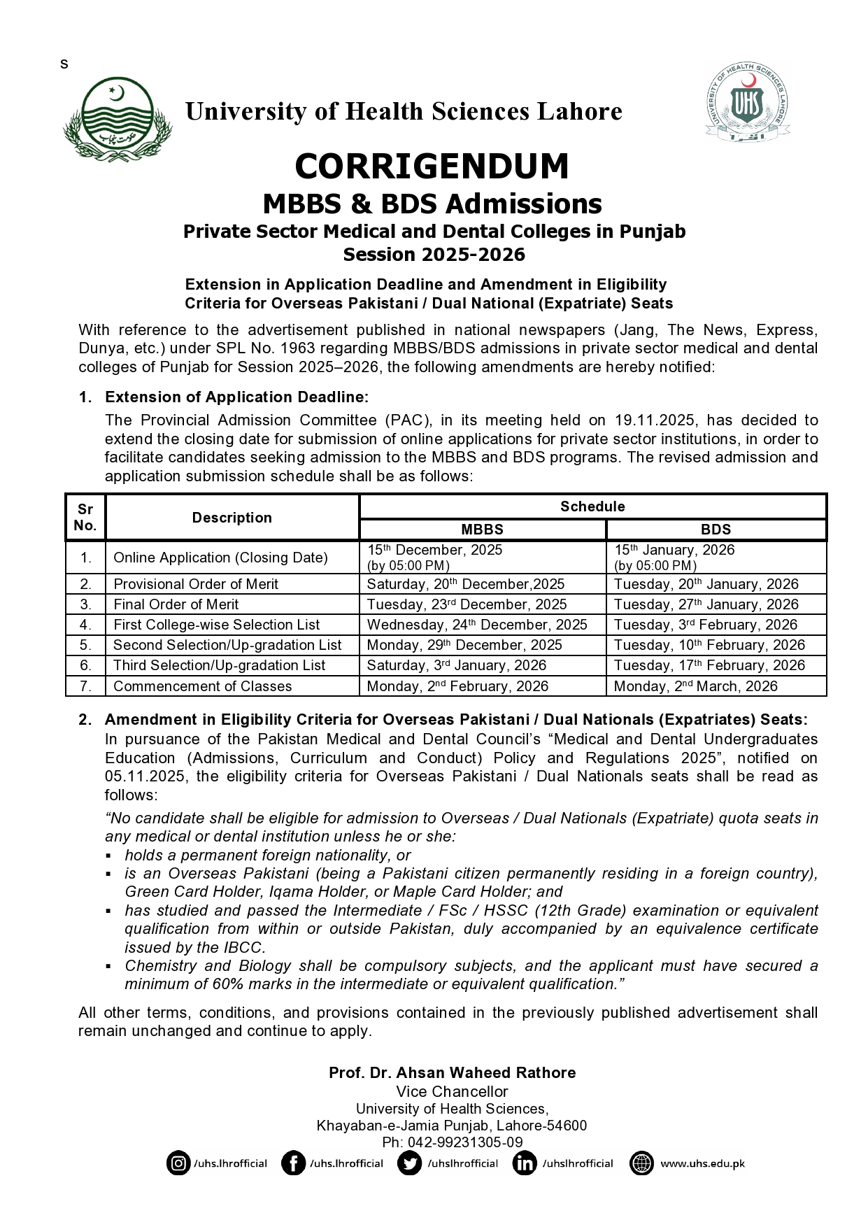 CORRIGENDUM: MBBS & BDS Admissions Private Sector Medical and Dental Colleges in Punjab Session 2025-2026