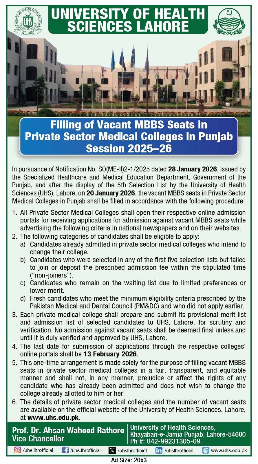 Seventh College-Wise Selection/Upgradation List for Admission against Open Merit and Quota seats (UDD, Cholistan, Reciprocal, Overseas, Disability) in Public Sector Medical Colleges in Punjab Session 2025-2026