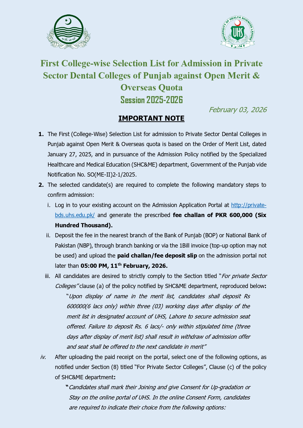 First College-wise Selection List for Admission in Private Sector Dental Colleges of Punjab against Open Merit & Overseas Quota Session 2025-2026