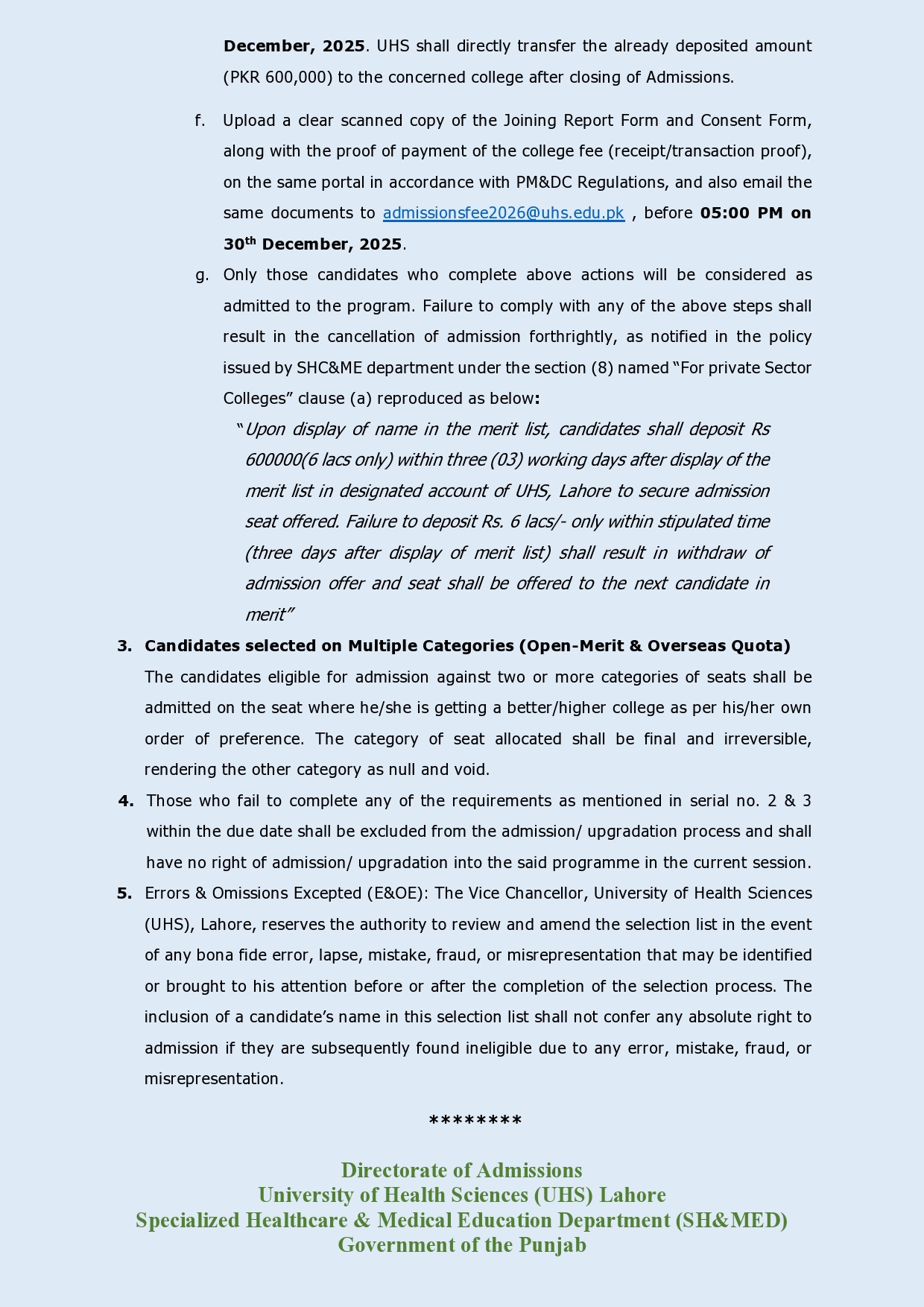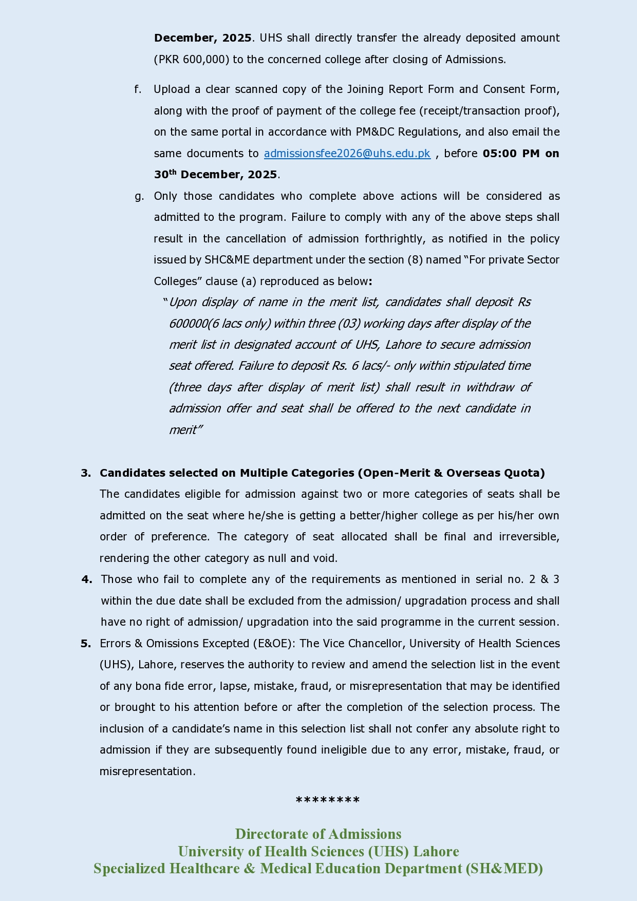 First College-wise Selection List for Admission in Private Sector Medical Colleges of Punjab against Open Merit & Overseas Quota Session 2025-2026