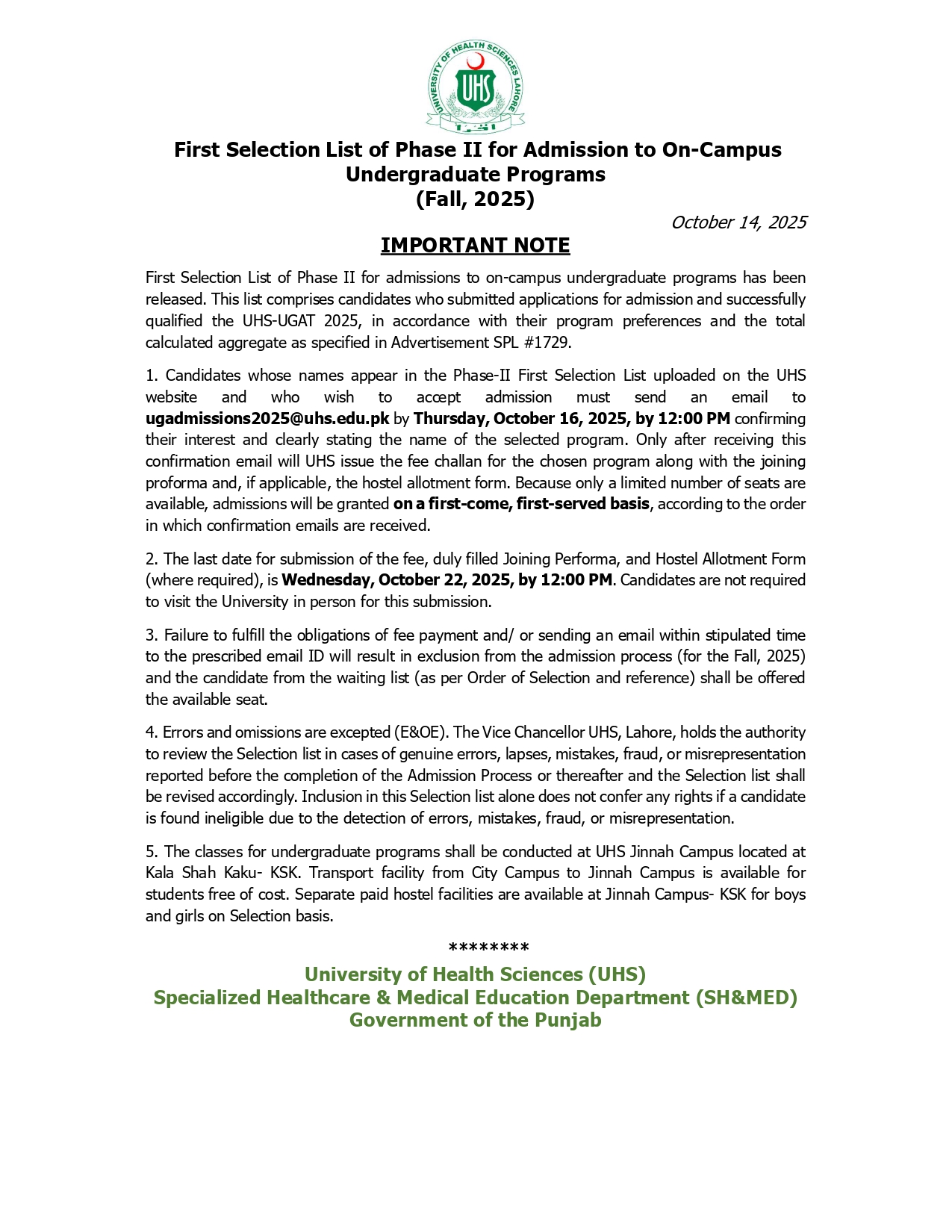 First Selection List of Phase-II for Admission on-Campus Undergraduate Programs(Fall 2025)
