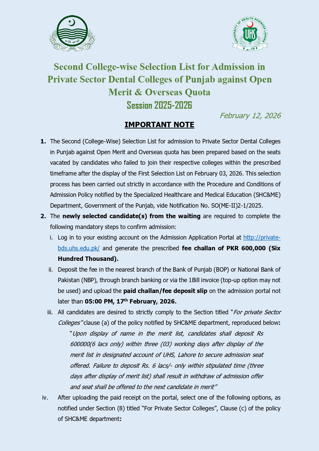 Second College-wise Selection List for Admission in Private Sector Dental Colleges of Punjab against Open Merit & Overseas Quota Session 2025-2026