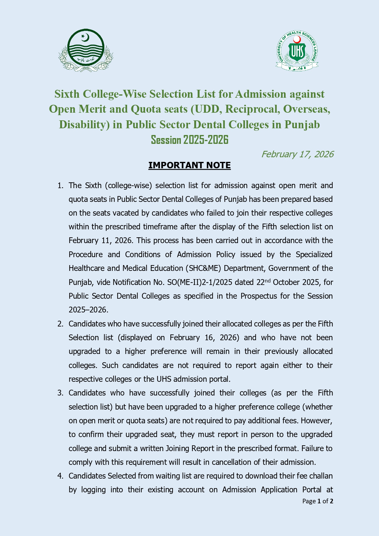 Sixth College-Wise Selection List for Admission against Open Merit and Quota seats (UDD, Reciprocal, Overseas, Disability) in Public Sector Dental Colleges in Punjab Session 2025-2026