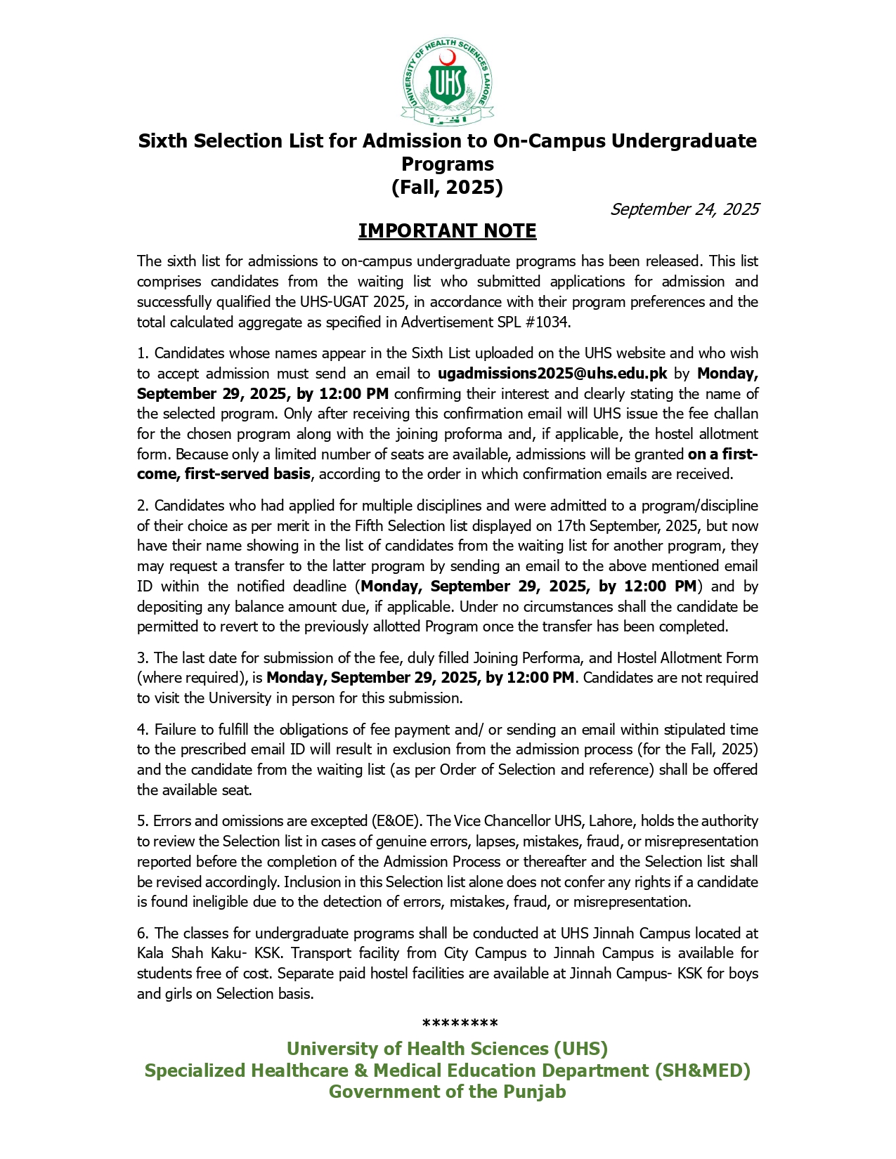 Sixth Selection List for Admission on-Campus Undergraduate Programs (Fall 2025)