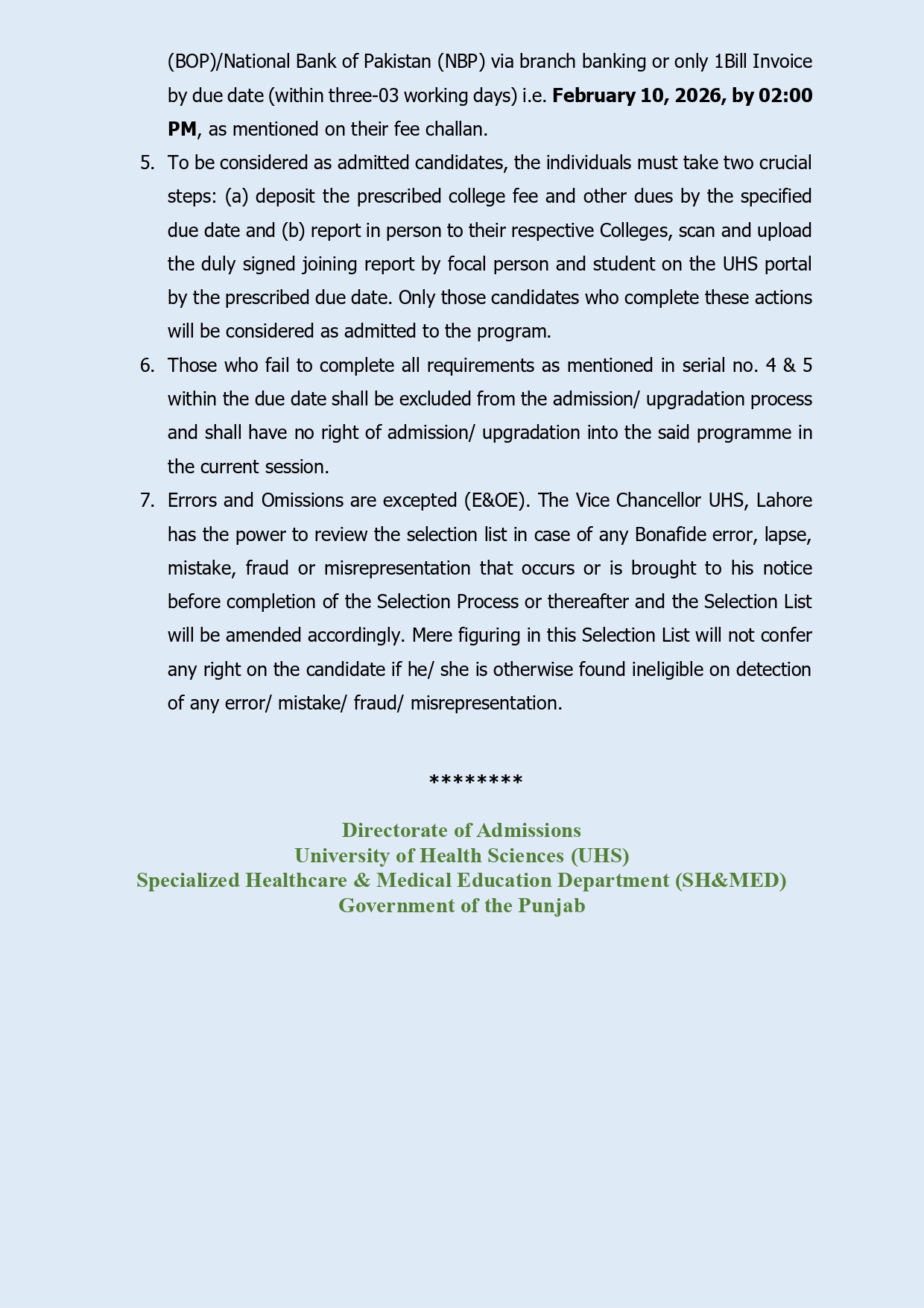 Eighth College-Wise Selection/Upgradation List for Admission against Open Merit and Quota seats (UDD, Cholistan, Reciprocal, Overseas, Disability) in Public Sector Medical Colleges in Punjab Session 2025-2026