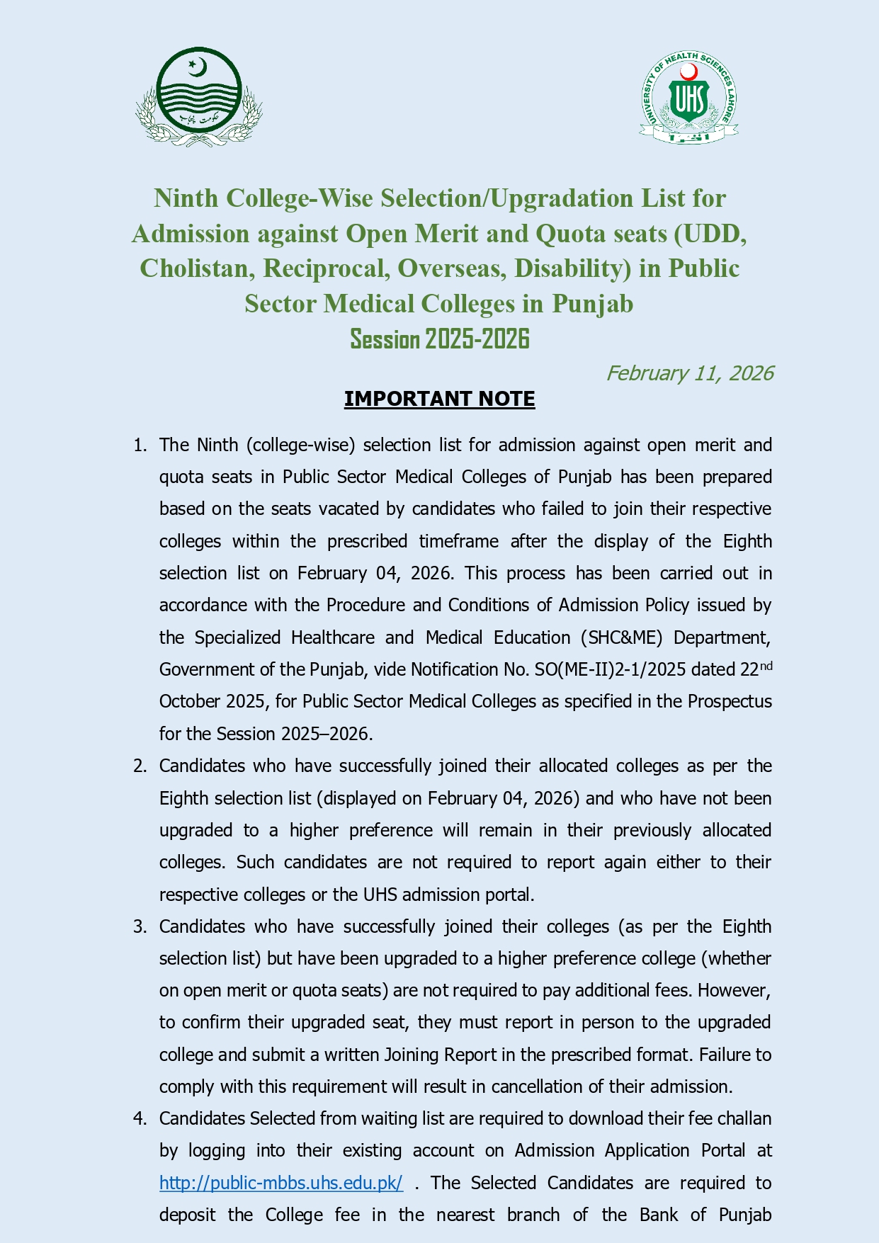 Ninth College-Wise Selection/Upgradation List for Admission against Open Merit and Quota seats (UDD, Cholistan, Reciprocal, Overseas, Disability) in Public Sector Medical Colleges in Punjab Session 2025-2026