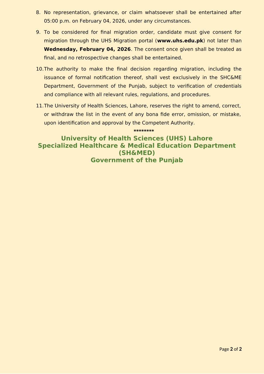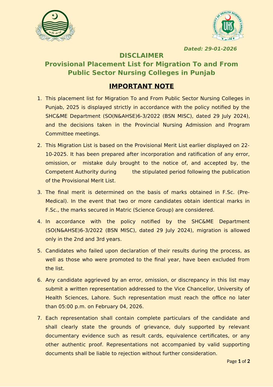 Provisional Placement List for Migration To and From Public Sector Nursing Colleges in Punjab, 2025