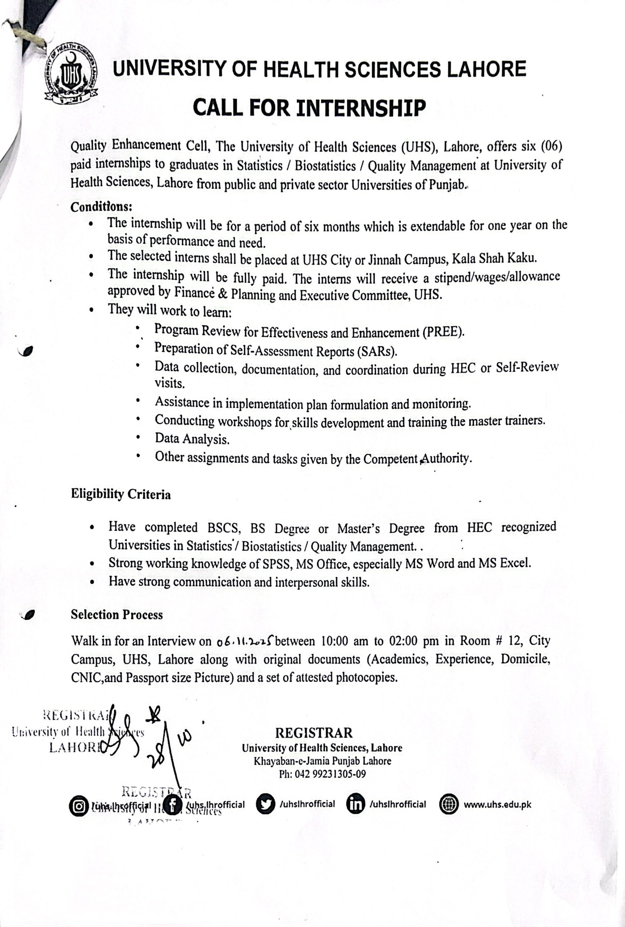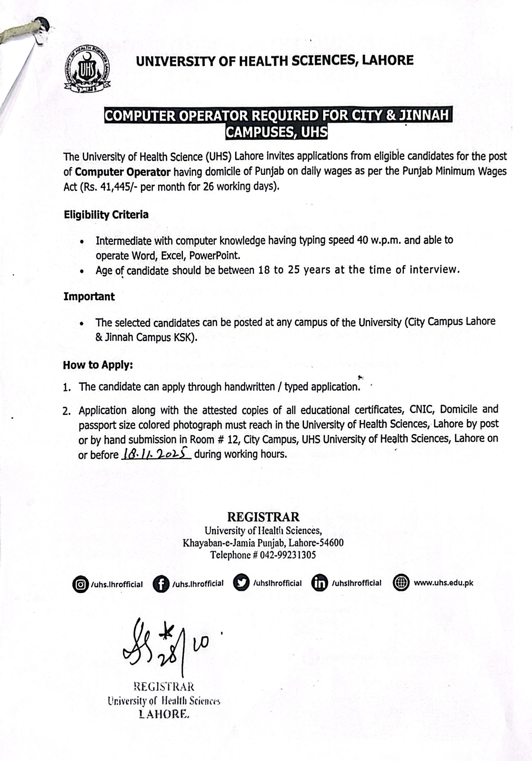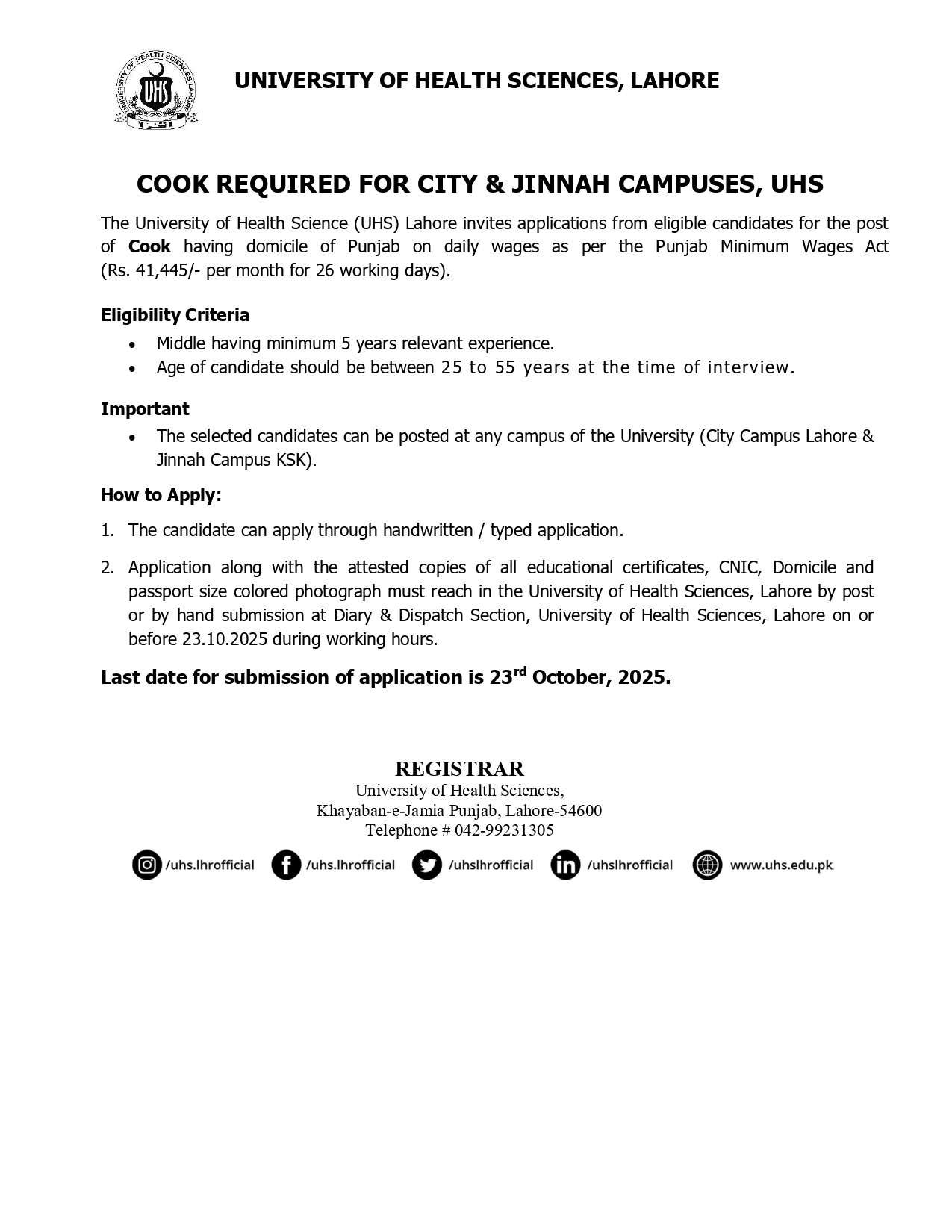 The University of Health Science (UHS) Lahore is a public sector organization which offers a congenial working environment with excellent opportunity for personal and professional growth. It is an equal opportunity employer. The University invites applications from eligible candidates having domicile of Punjab for the following posts: -.
