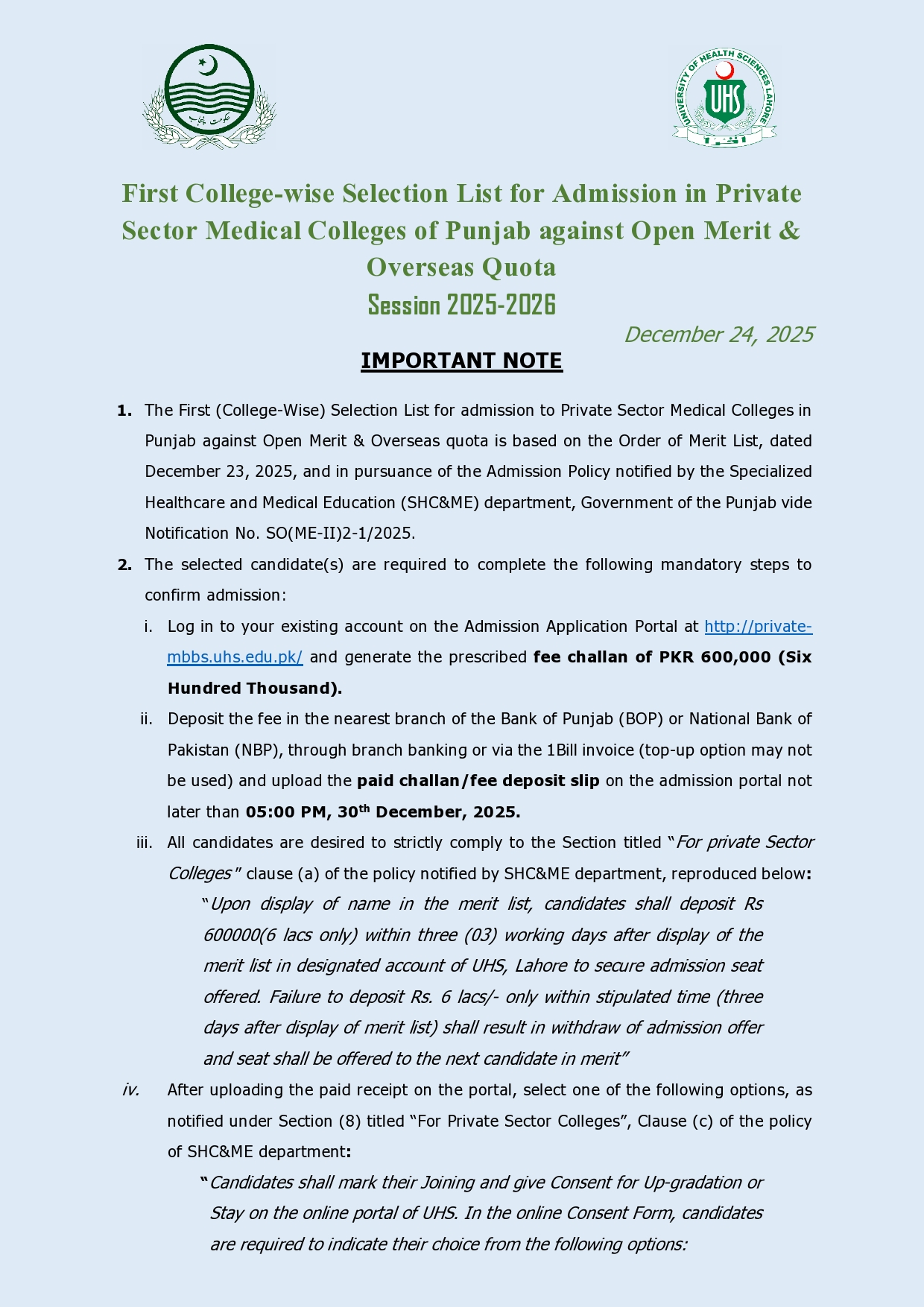 First College-wise Selection List for Admission in Private Sector Medical Colleges of Punjab against Open Merit & Overseas Quota Session 2025-2026