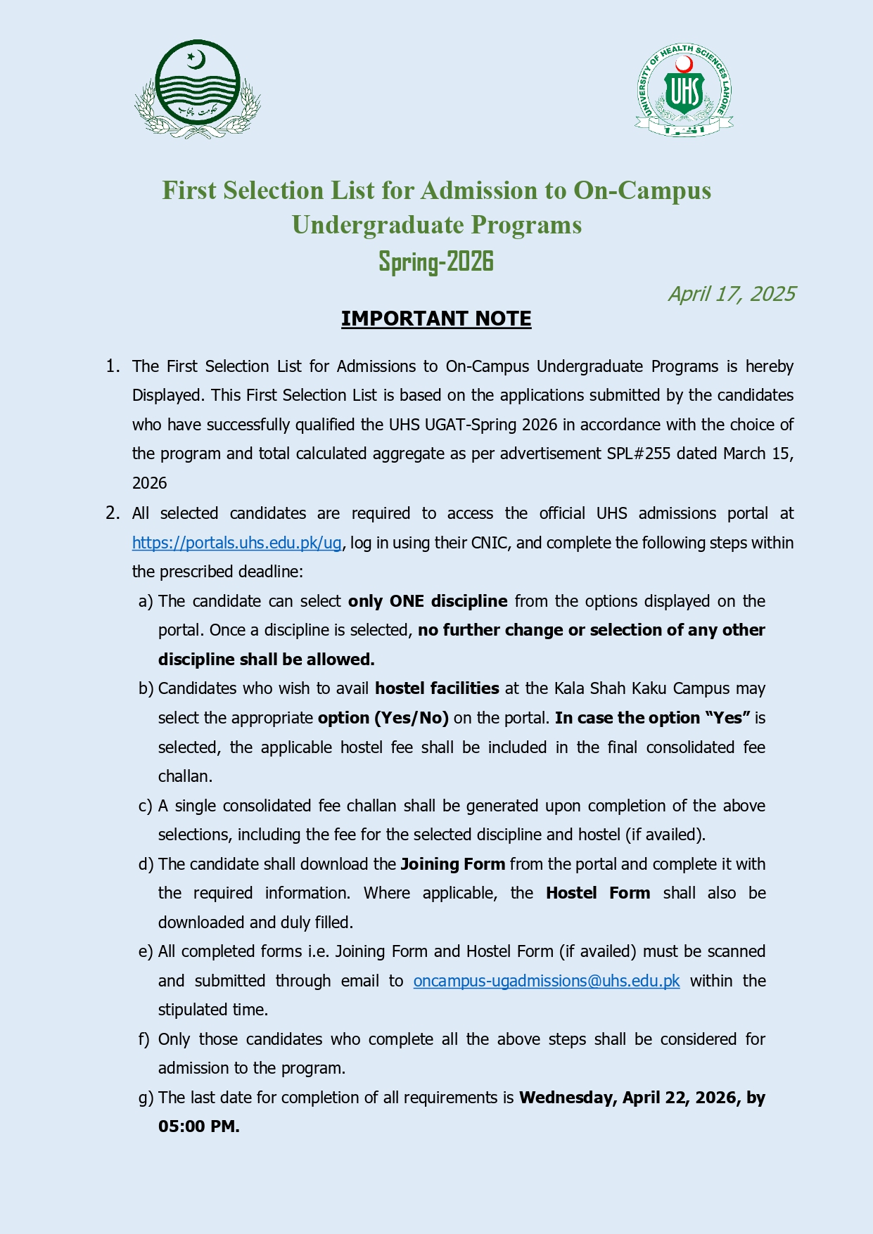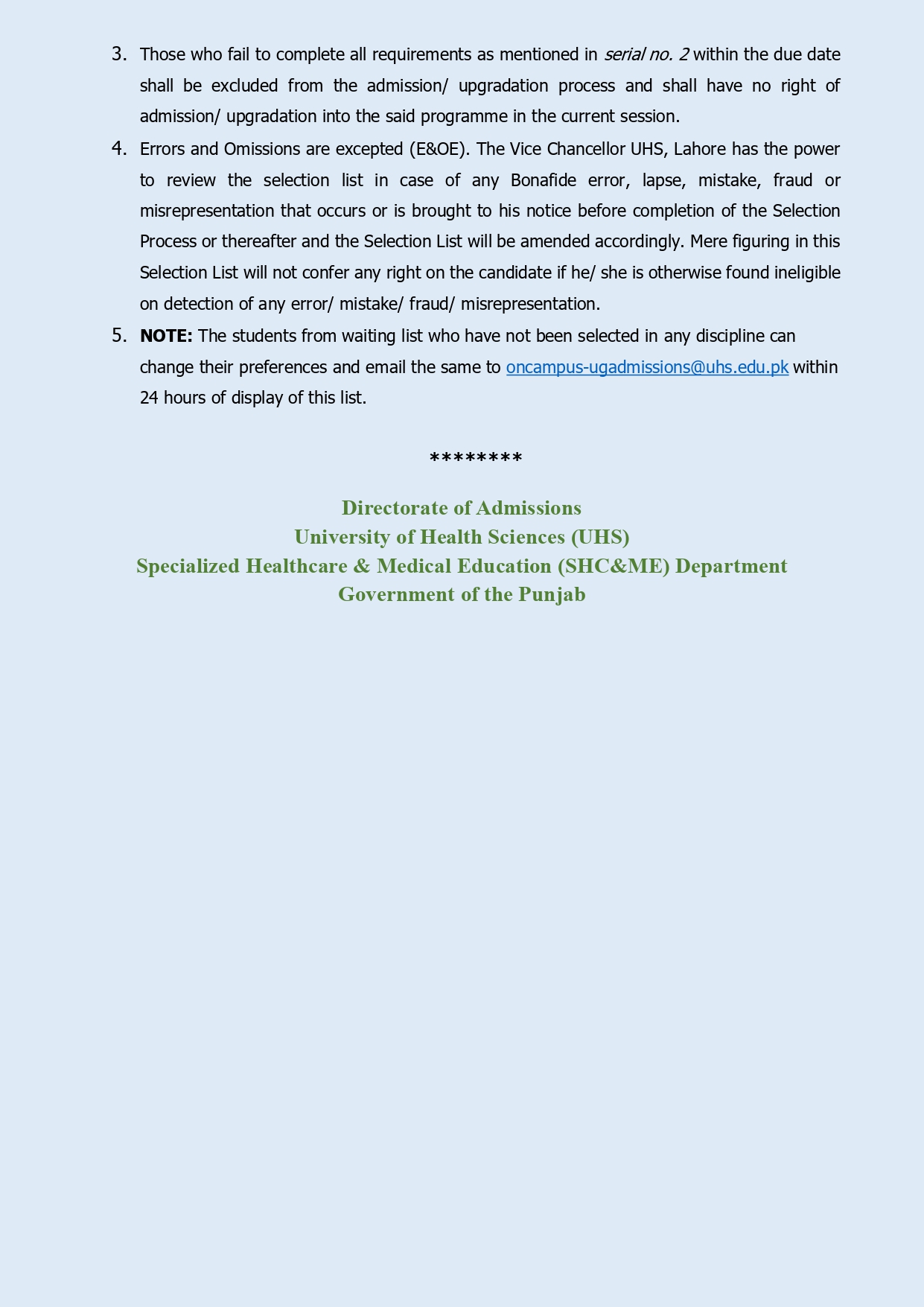 B.S Human Nutrition & Dietetics, BS Dental Technology, BS Emergency and Intensive Care |