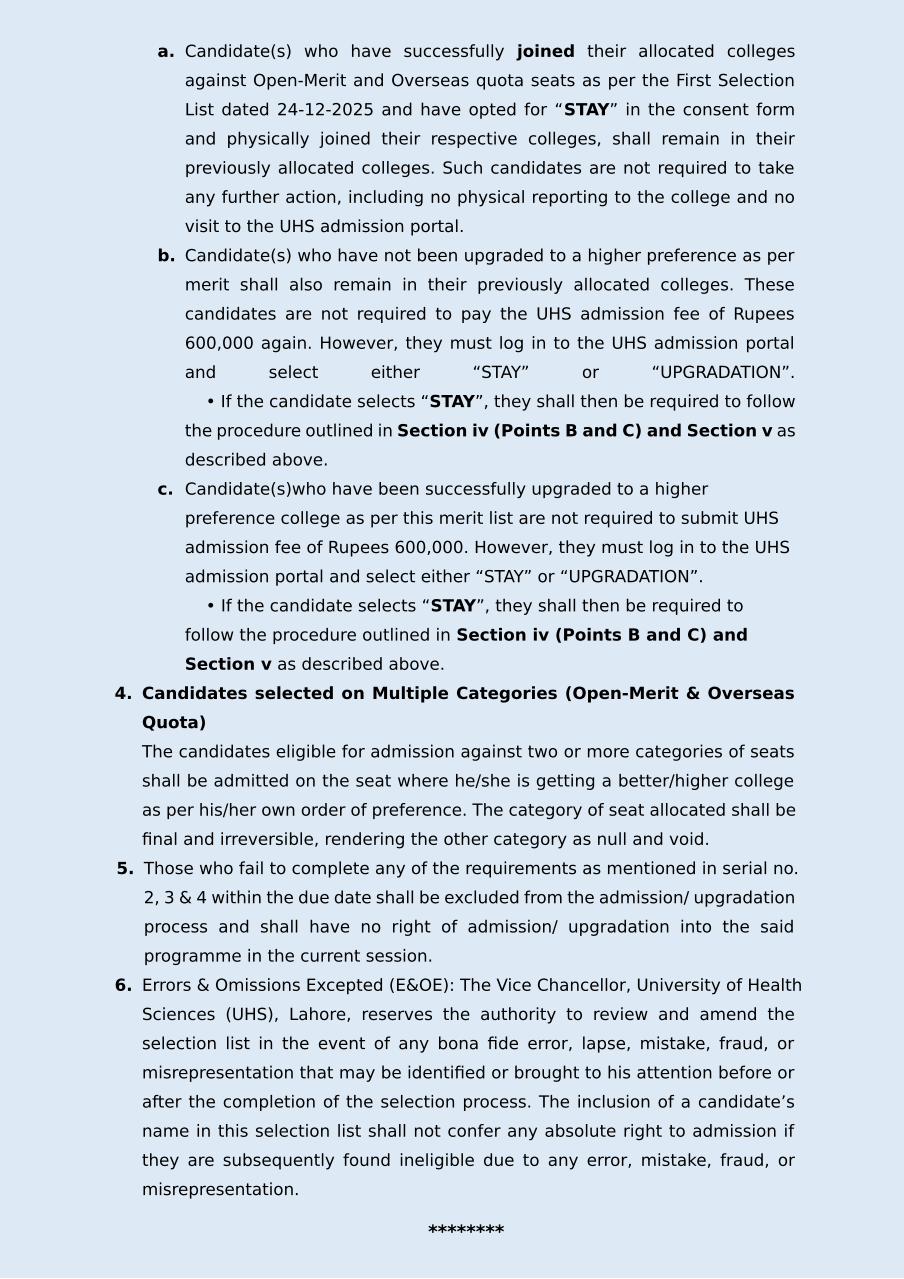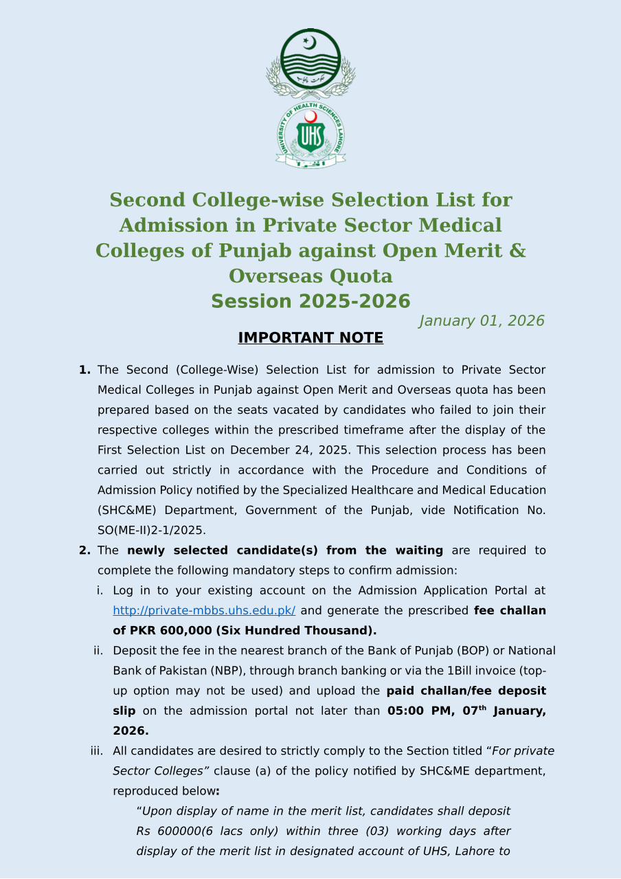 Second College-wise Selection List for Admission in Private Sector Medical Colleges of Punjab against Open Merit & Overseas Quota Session 2025-2026