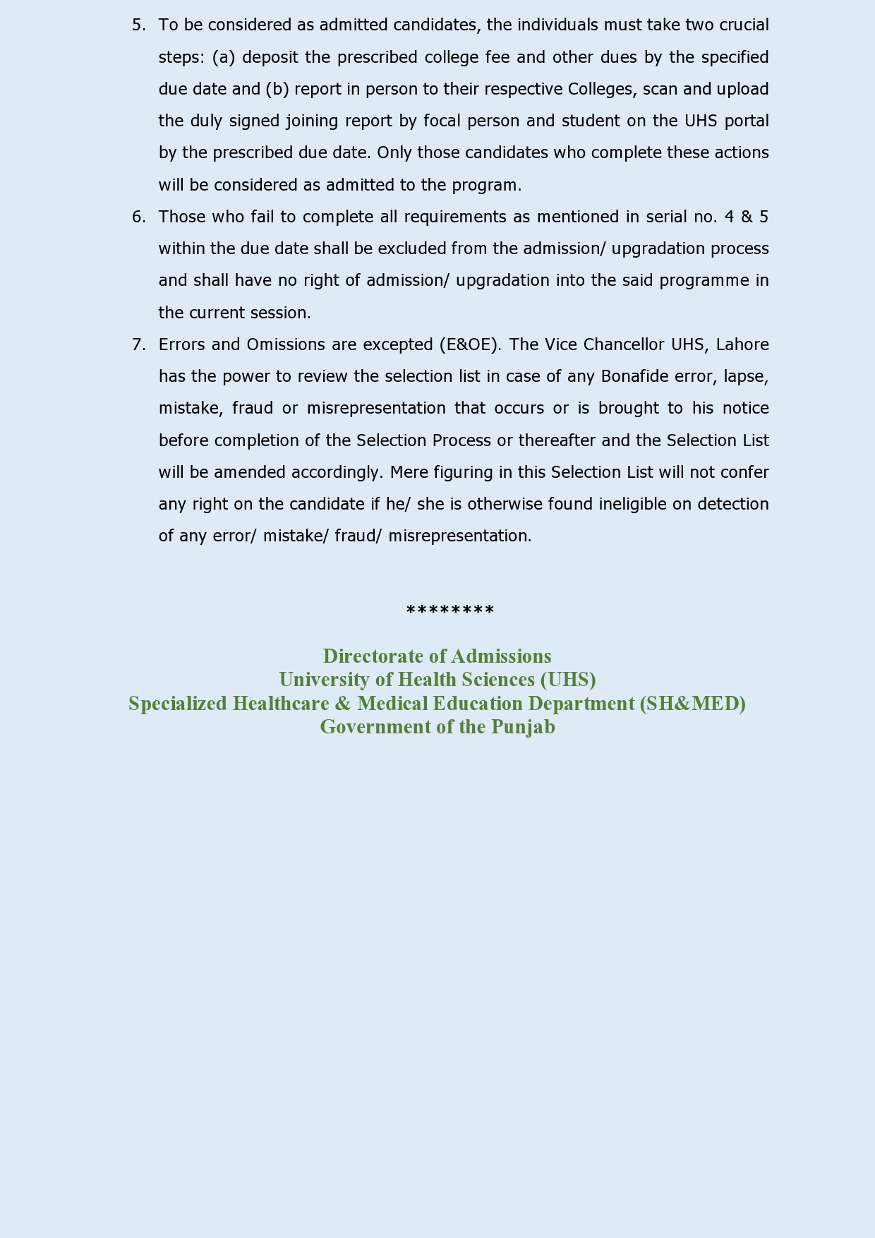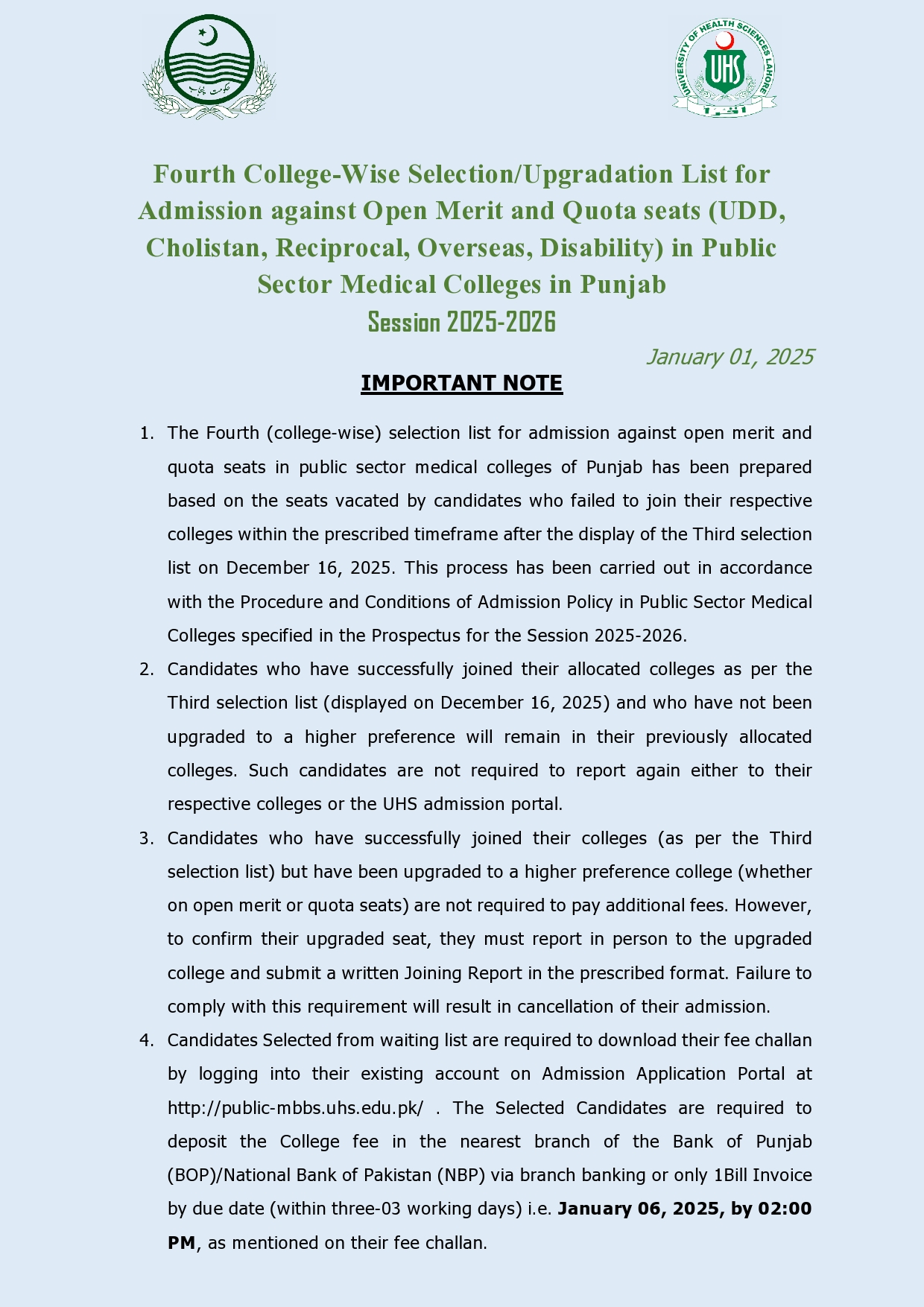 Fourth College-Wise Selection/Upgradation List for Admission against Open Merit and Quota seats (UDD, Cholistan, Reciprocal, Overseas, Disability) in Public Sector Medical Colleges in Punjab Session 2025-2026