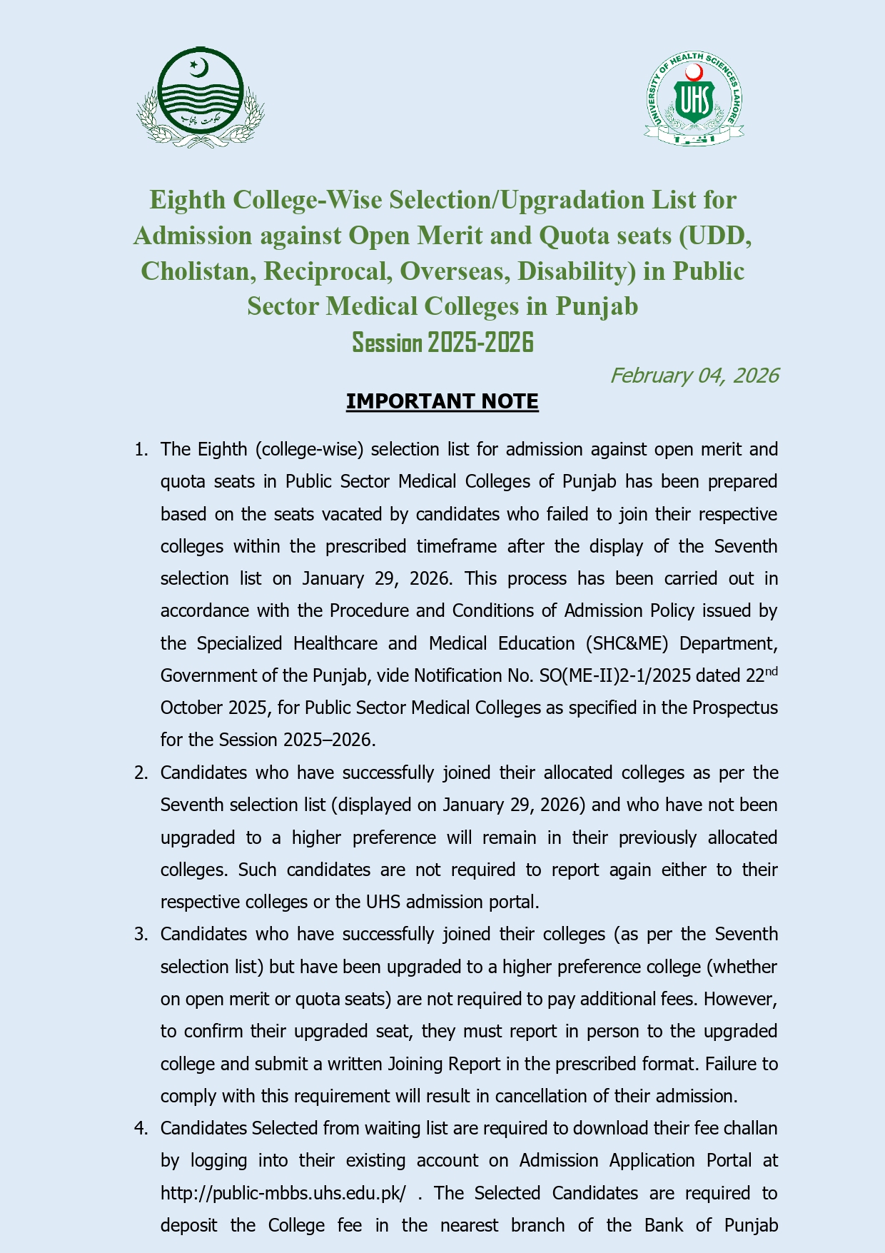 Eighth College-Wise Selection/Upgradation List for Admission against Open Merit and Quota seats (UDD, Cholistan, Reciprocal, Overseas, Disability) in Public Sector Medical Colleges in Punjab Session 2025-2026