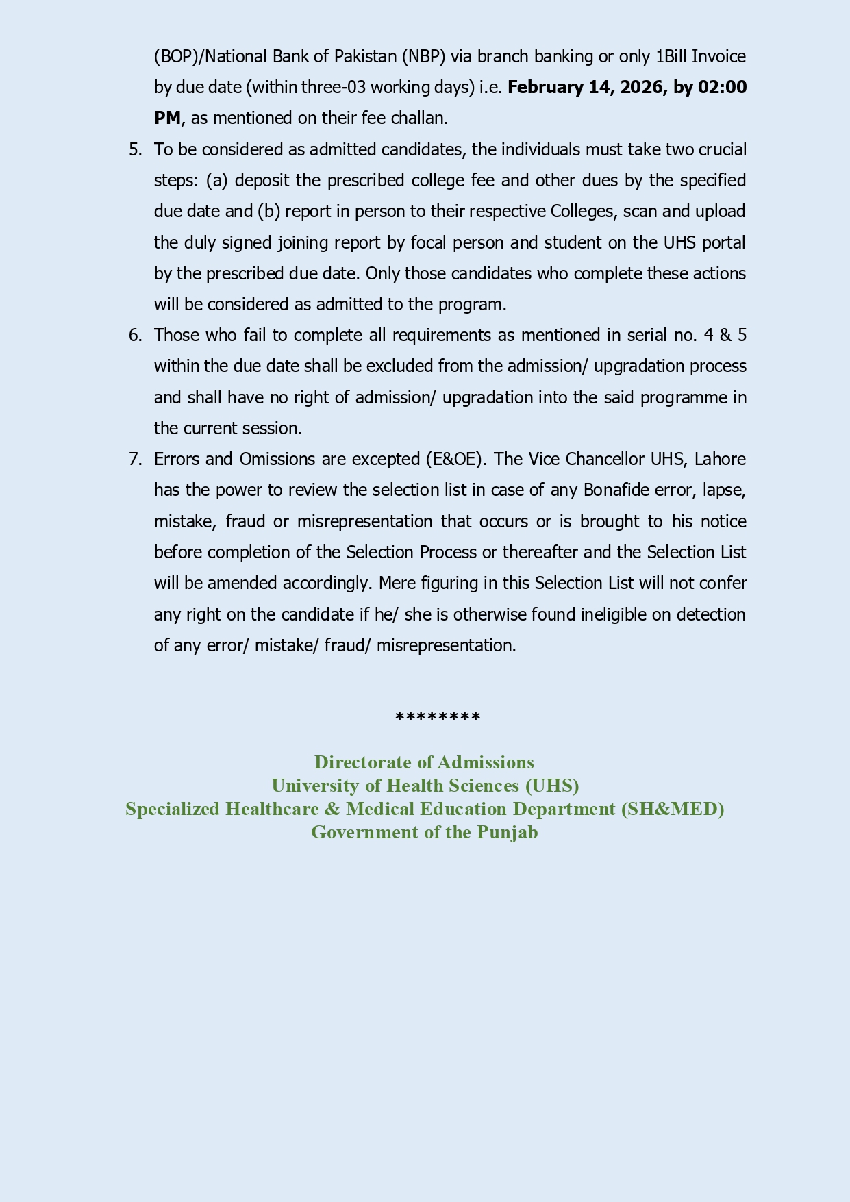 Ninth College-Wise Selection/Upgradation List for Admission against Open Merit and Quota seats (UDD, Cholistan, Reciprocal, Overseas, Disability) in Public Sector Medical Colleges in Punjab Session 2025-2026