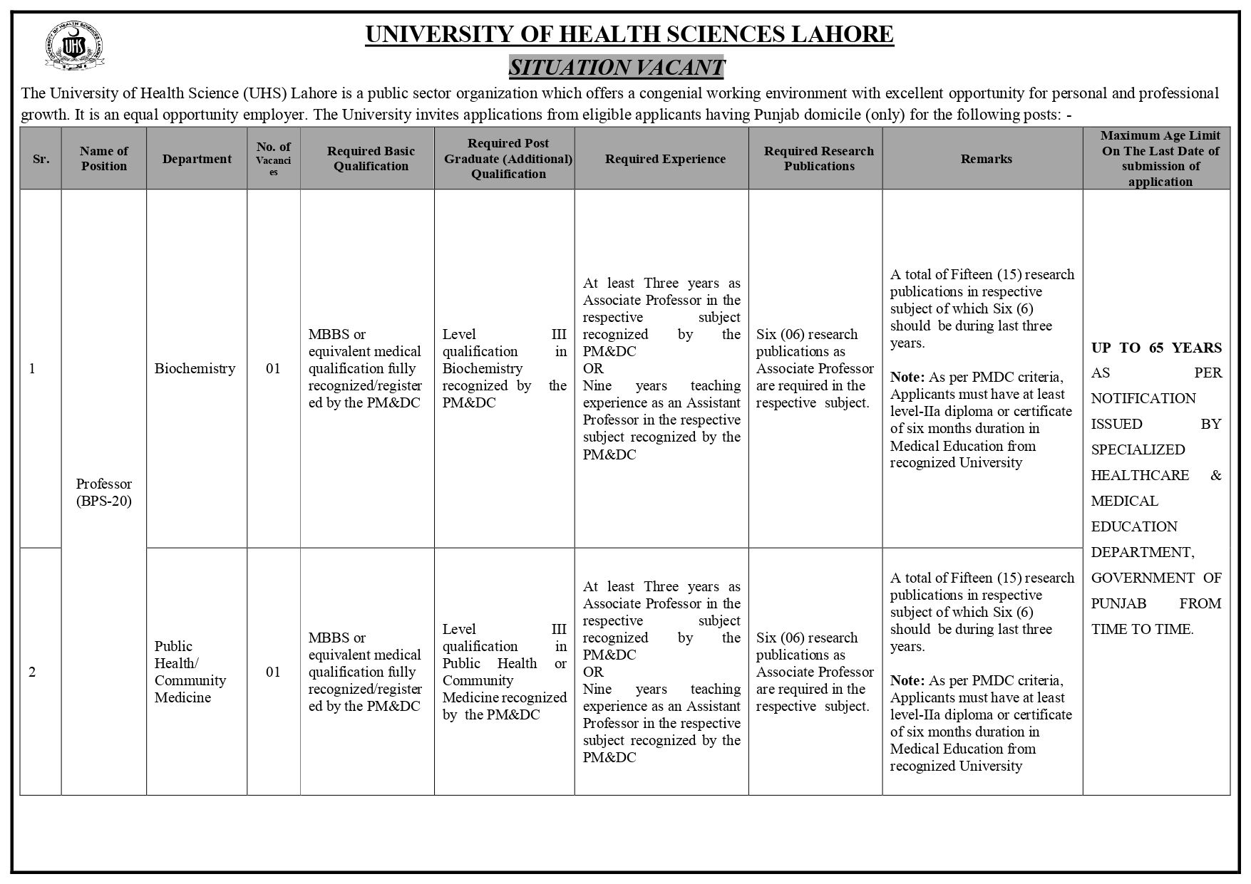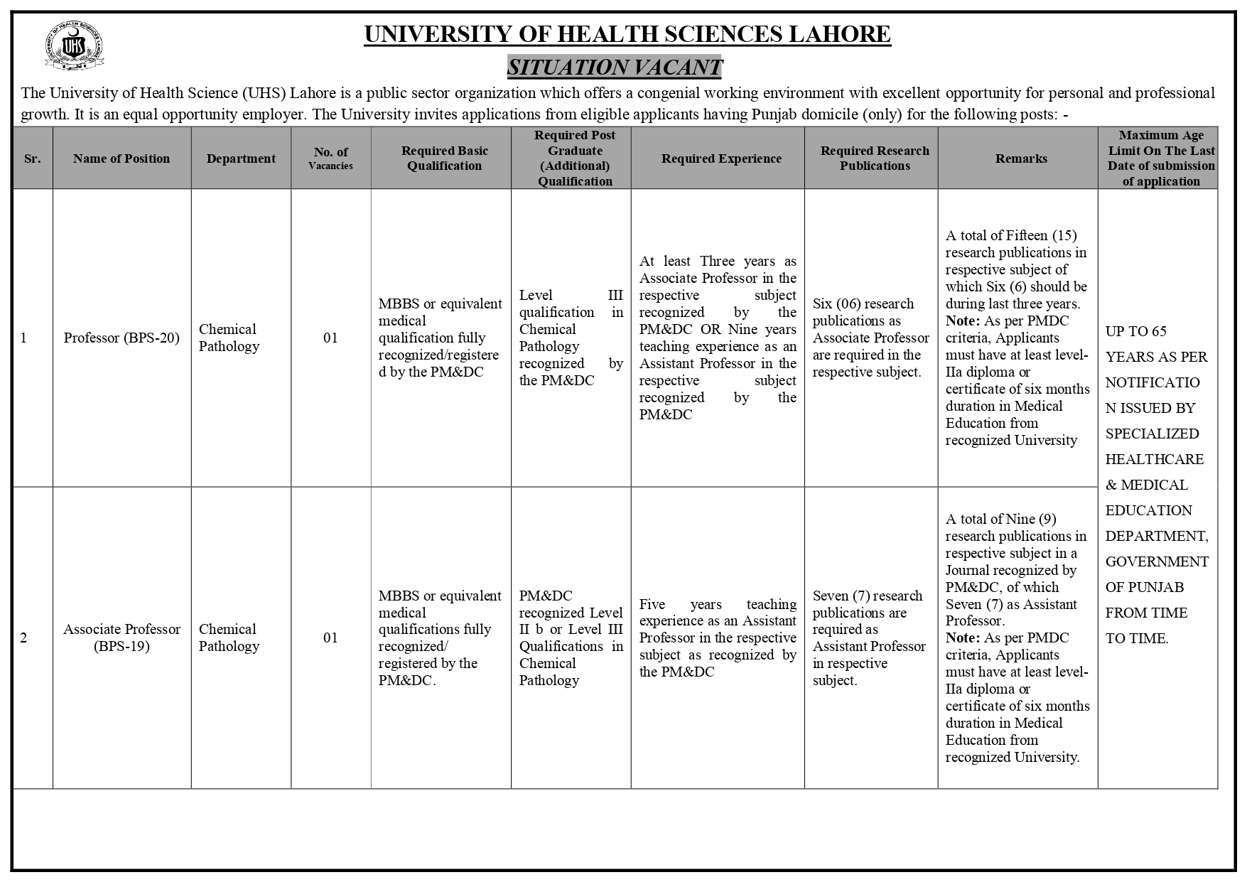 The University of Health Science (UHS) Lahore is a public sector organization which offers a congenial working environment with excellent opportunity for personal and professional growth. It is an equal opportunity employer. The University invites applications from eligible candidates having domicile of Punjab for the following posts: -.