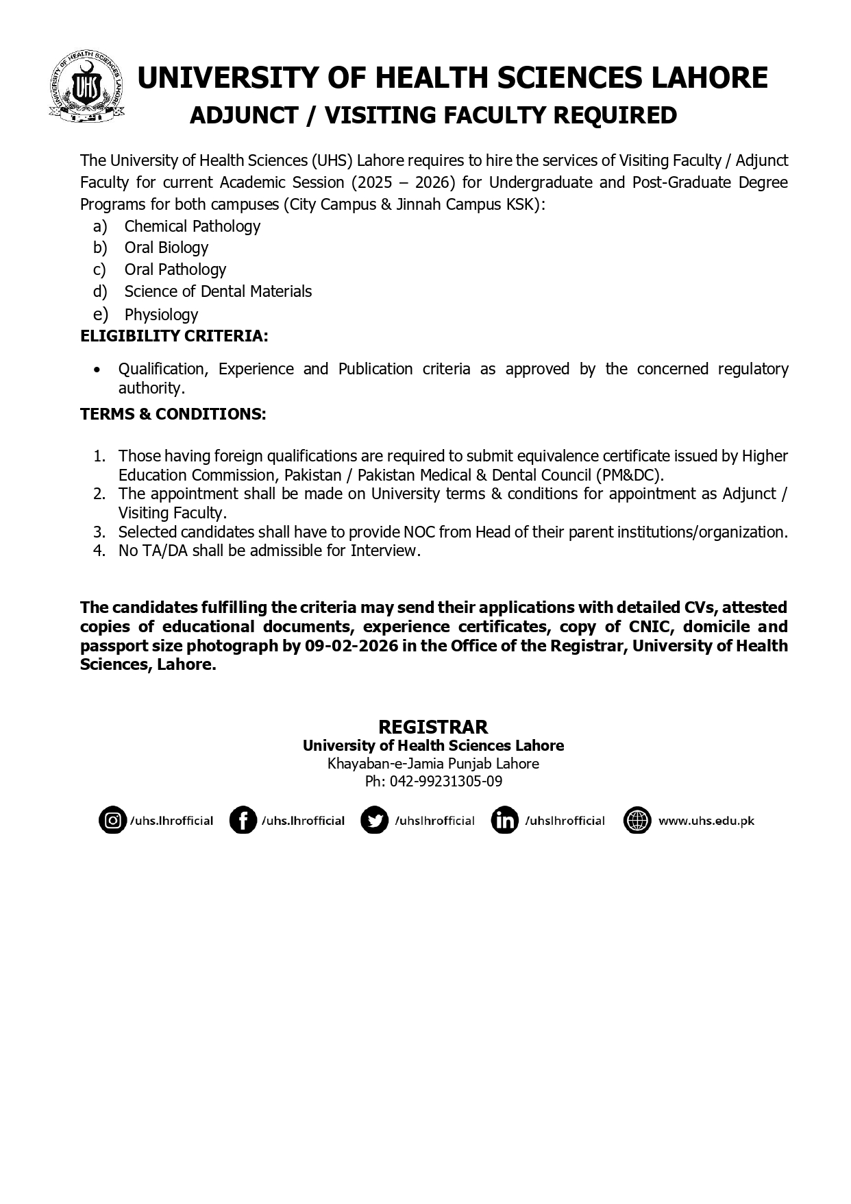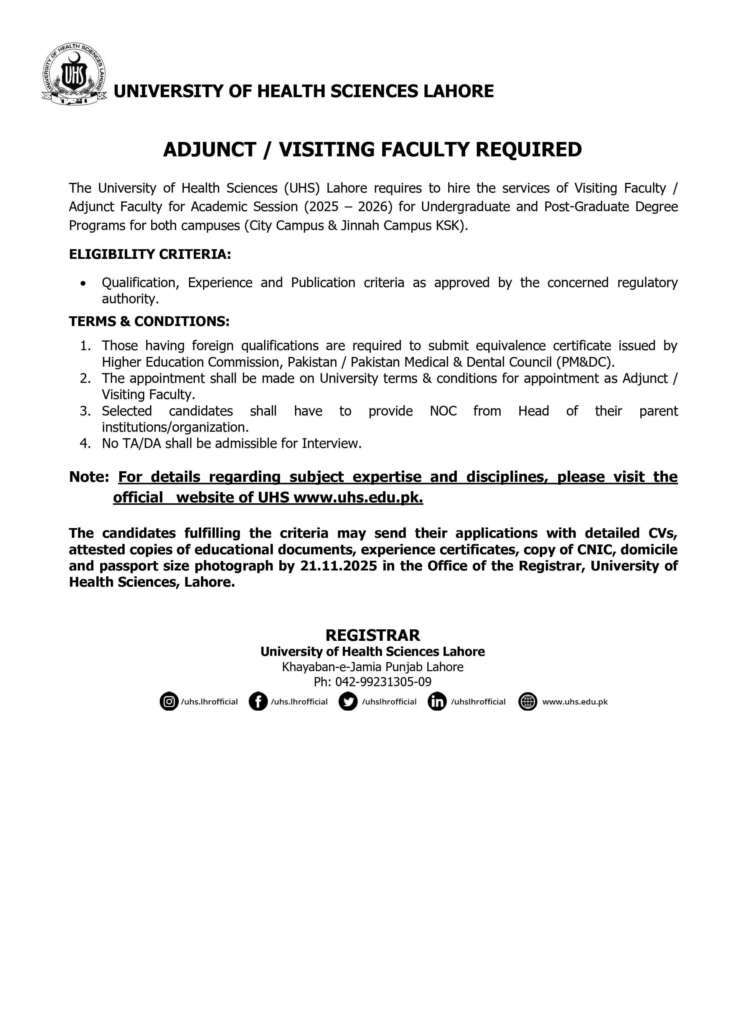 Fax: 99230870 Website: www.uhs.edu.pkThe University of Health Sciences (UHS) Lahore, an equal opportunity employee, invites applications from eligible candidates for appointment against as following posts: