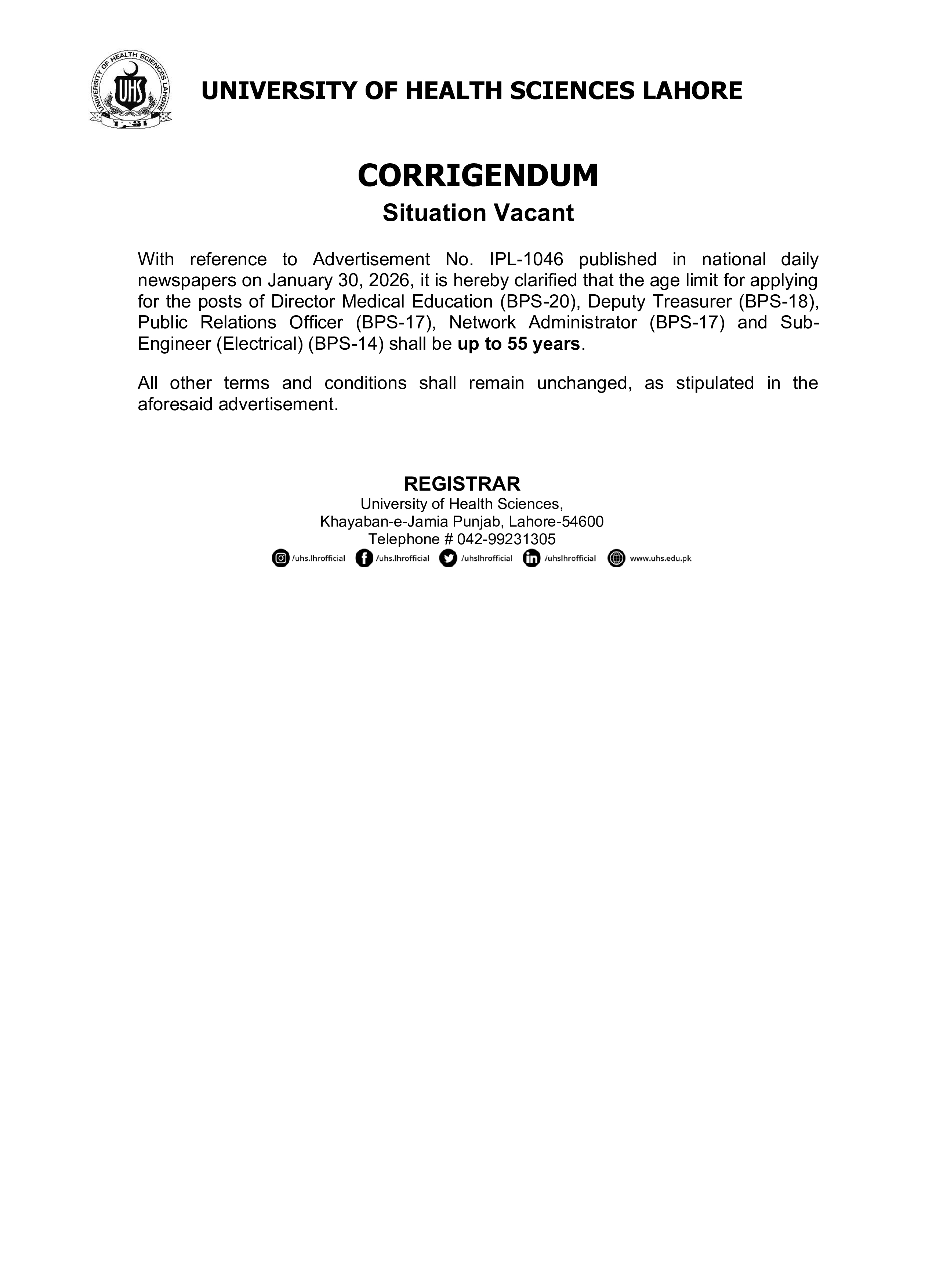 REGISTRAR University of Health Sciences Lahore Khayaban-e-Jamia Punjab, Lahore-54600 Helpline (24/7) # 042-111-33-33-66 Website: www.uhs.edu.pk