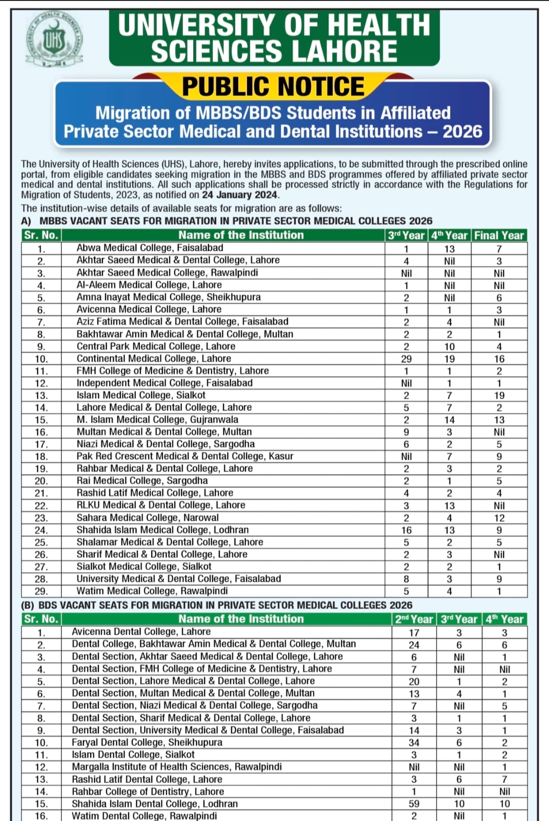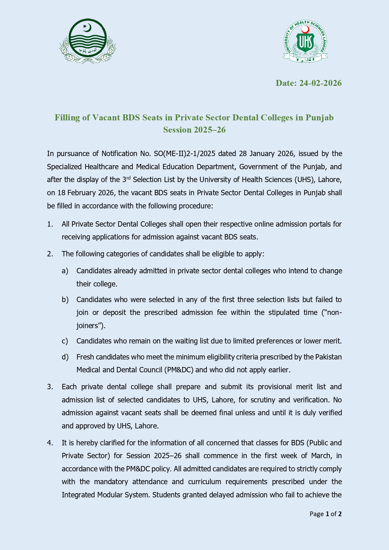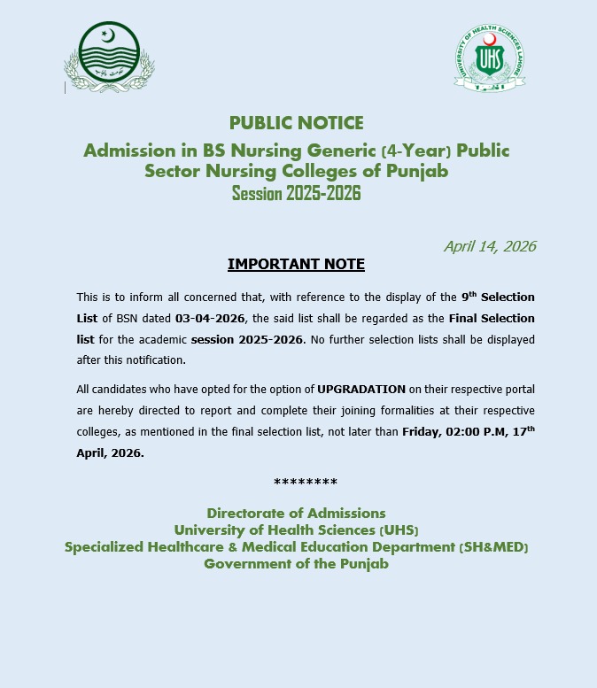 Fourth Selection List for Admission in Lady Health Visitor (LHV) Course (2-Year Diploma) in Public Sector Nursing Colleges of Punjab Session 2025-2026